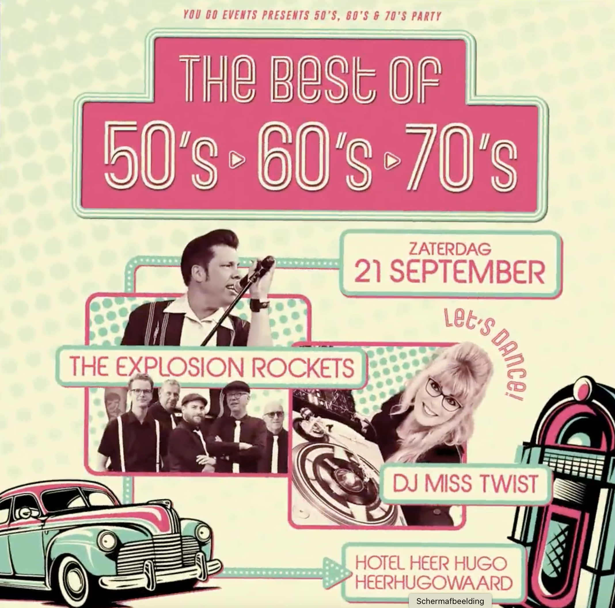Meerdere malen uitgeroepen als de absolute nummer 1 Rock ‘n Roll band van Nederland, The Explosion Rockets! Door hun zeer opzwepende optredens is stilstaan geen optie! Zo stonden ze dan ook op de grootste podia van Nederland, waaronder Ahoy Rotterdam, Rai Amsterdam en 013 in Tilburg. En naast Nederland is deze band ook actief in het buitenland waarbij ze deze zomer touren door o.a. Spanje, Belgie, Duitsland en Wales! Geniet avondvullend van 40 jaar enorme ervaring!