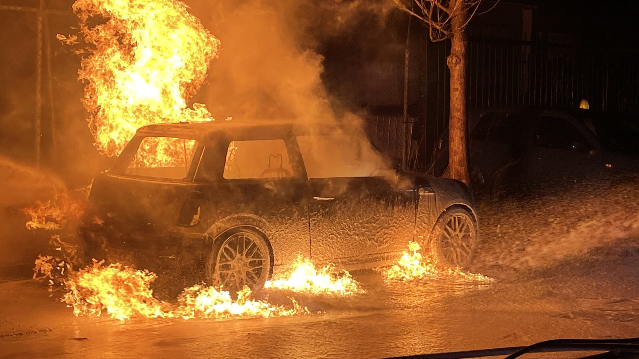 De auto staat geparkeerd bij een autobedrijf maar het pand zelf komt niet in gevaar. De politie zal onderzoeken hoe de brand ontstaan is.