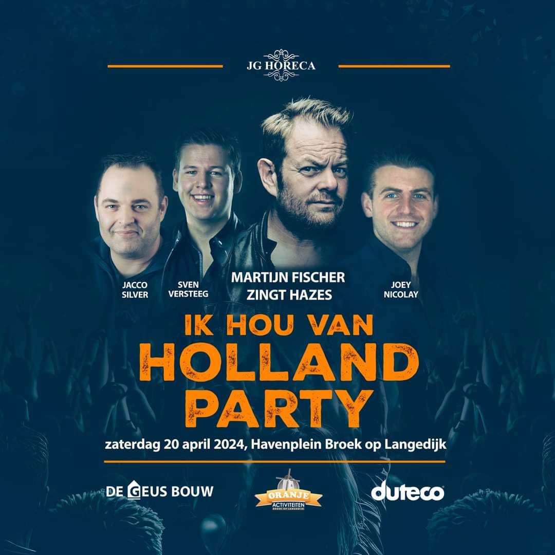 Op zaterdagavond 20 april is de feesttent op het Havenplein geopend. Tijdens de Ik Hou van Holland-Party 20 april 2024 Havenplein Broek op Langedijk treden diverse artiesten op. Onder andere Martijn Fischer (met de hits van Hazes), Sven Versteeg en Joey Nicolay en Jacco Silvermaken hun opwachting!