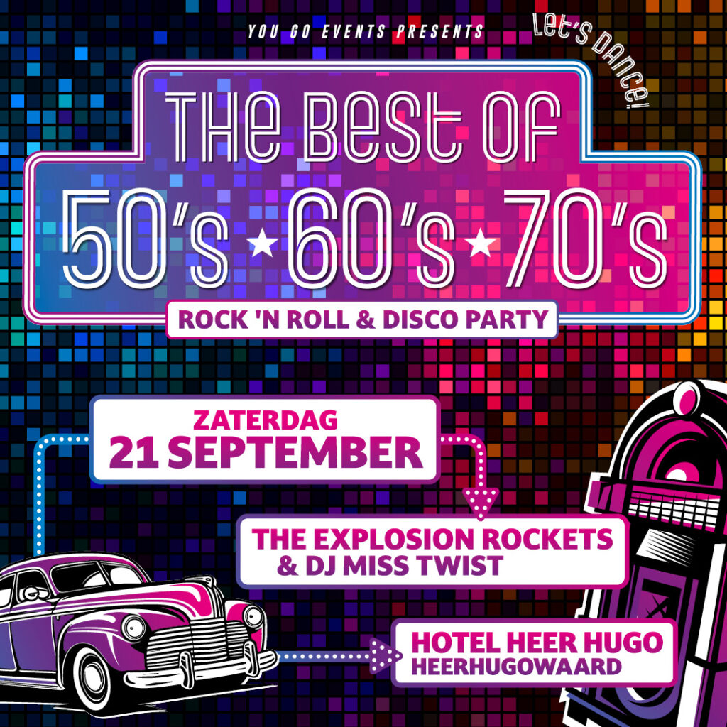 Bent u een muziekliefhebber van Elvis en Buddy Holly tot aan de Beatles en ABBA? Mis dit dan niet! ‘The Best of 50’s / 60’s / 70’s’ is een wervelende muzikale show, die u gezien moèt hebben! Live band ‘The Explosion Rockets’ is meerdere malen uitgeroepen als de absolute nummer 1 jaren 50 en 60 band van Nederland! Door hun zeer opzwepende optredens is stilstaan geen optie. En met haar onweerstaanbare uitstraling en onuitputtelijke platencollectie is DJ Miss Twist dé absolute vintage vinyl-DJ van Nederland!