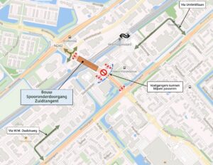 Het kruispunt Stationsplein/Zuidtangent is een week dicht, van maandag 9 maart tot en met vrijdag 13 maart, om de wegen aan te sluiten op de nieuwe spooronderdoorgang. Omrijden kan via de Westtangent en W.M. Dudokweg of Umbriëllaan. Van vrijdagavond 13 op zaterdagochtend 14 maart leggen we een verkeersdrempel aan nabij het P+R terrein Stationsplein. Het station blijft bereikbaar.