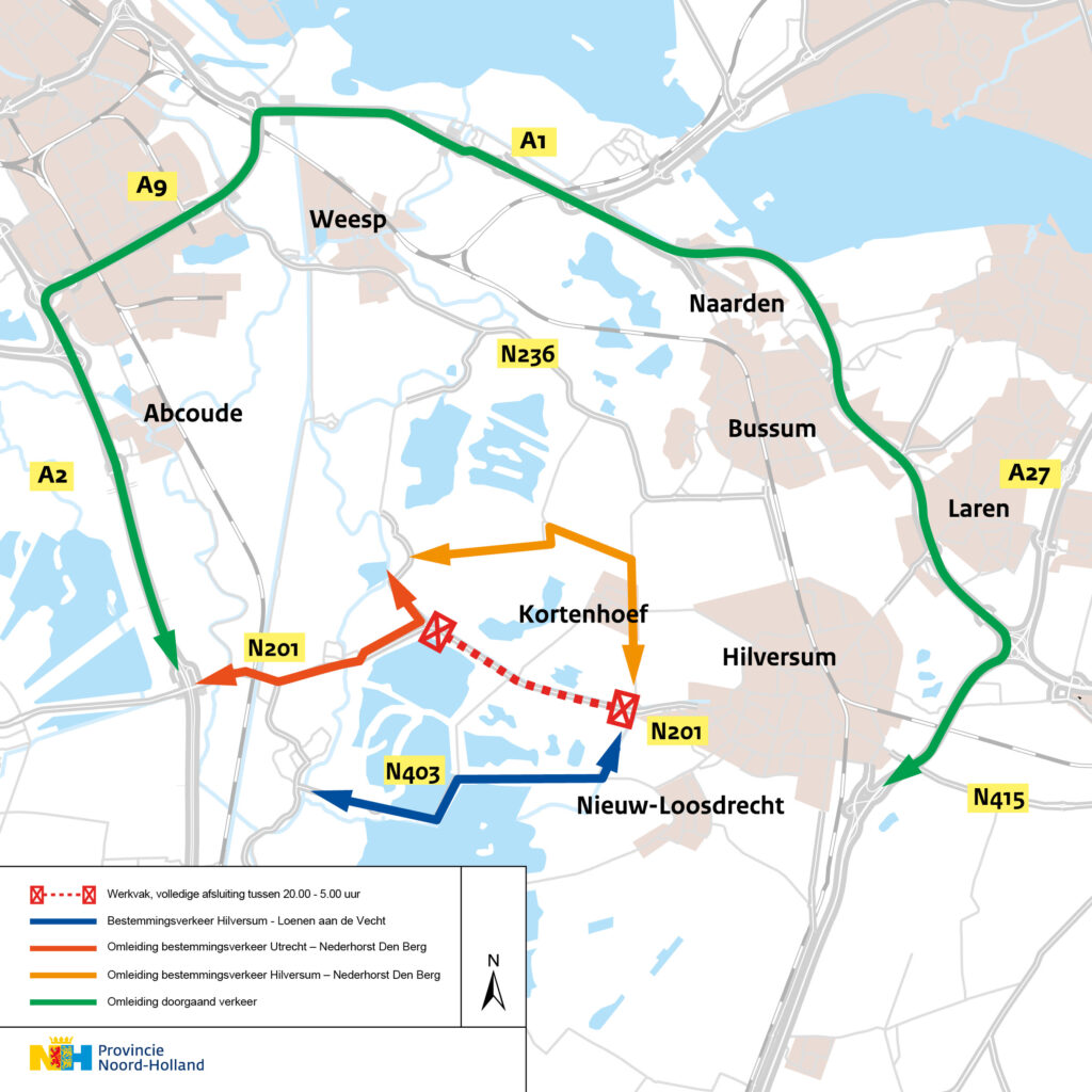 Tijdens de werkzaamheden in de avonden en nachten is de N201 afgesloten voor al het verkeer, behalve voor (brom)fietsers. In de eerste fase is de weg dicht tussen het kruispunt met de 1e Kanaalbrug tot de rotonde met de N523. In de tweede fase is de N201 in de avonden en nachten afgesloten tussen de Kortenhoefsedijk en de N201 ter hoogte van de jachthaven, bij de grens met de provincie Utrecht. (Brom)fietsers kunnen gebruik blijven maken van het fietspad.