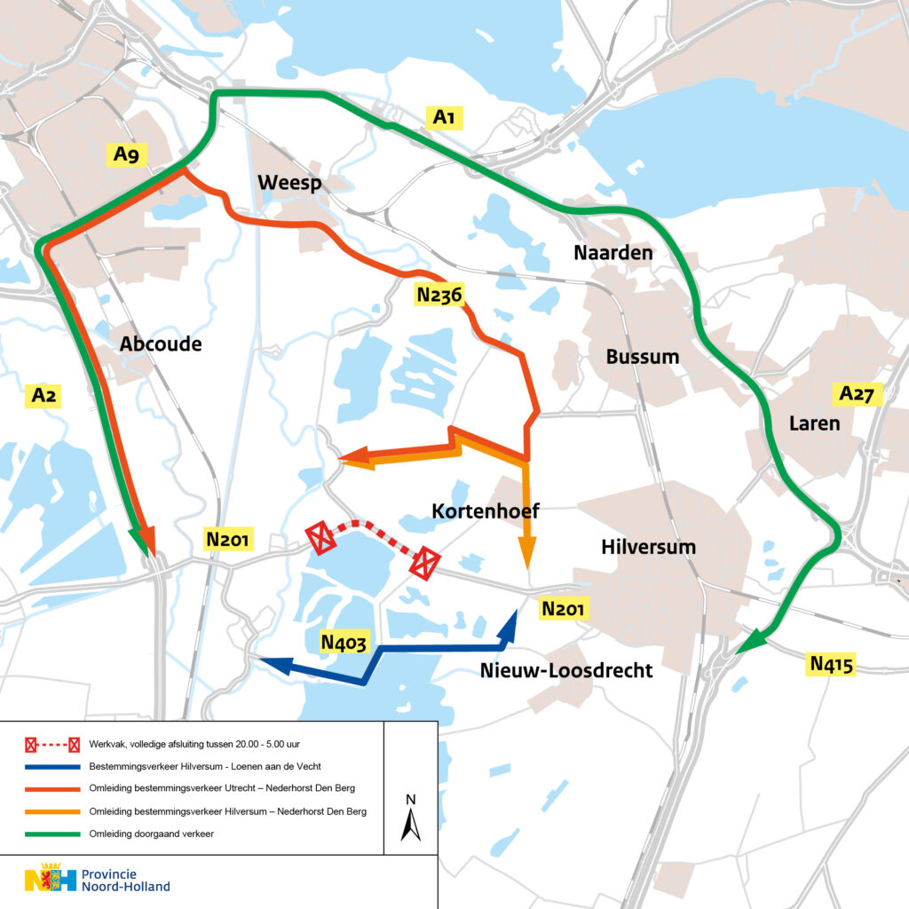 Doorgaand verkeer wordt omgeleid via de A27 en de A2. Verkeer tussen Hilversum en Nederhorst den Berg rijdt via de 1e Kanaalbrug, de Herenweg en de Middenweg. Verkeer tussen Hilversum en Loenen aan de Vecht rijdt via de Draaibrug, de Oud‑Loosdrechtsedijk en de N403.