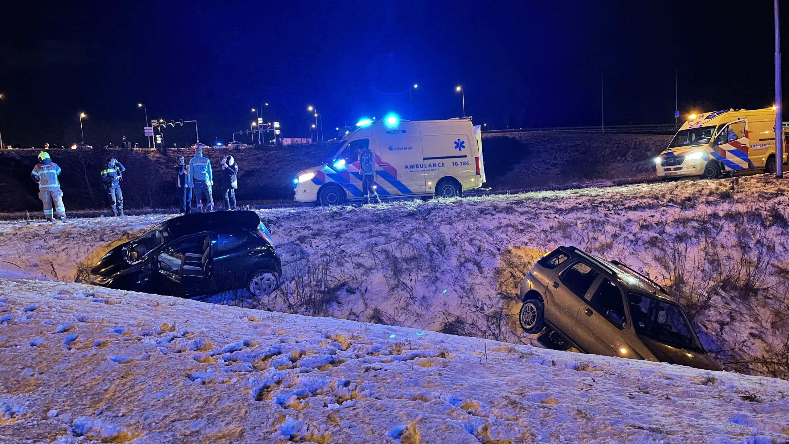 Door het strooien en het wegschuiven van het sneeuw is er een beetje sneeuwpap ontstaan en omdat dit een nogal aflopende bocht is zijn de wagens op het zelfde punt gaan schuiven en in de greppel beland. Een bergingsbedrijf zal de auto’s uit de greppel halen.