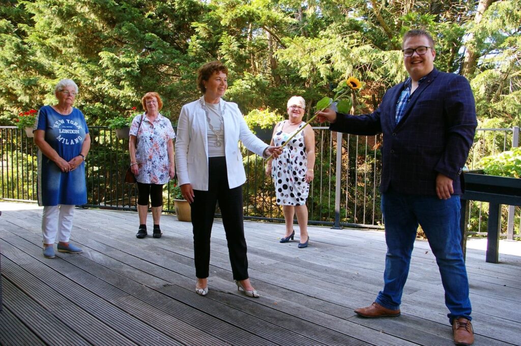 Bloemen houden van mensen en zeker ook de Zonnebloem. De lokale afdeling Zonnebloem Langedijk-Noord schonk dit weekend prachtige zonnebloemen aan inwoners die ziek zijn of een beperking hebben. Dat gebeurde in Noord-Scharwoude, Zuid-Scharwoude en Oudkarspel. Burgemeester Leontien Kompier deelde de bloemen vandaag uit tijdens de Nationale Ziekendag. Dat deed ze in zorgcentrum De Meander in Noord-Scharwoude, samen met vrijwilligers en bestuurders van De Zonnebloem Langedijk-Noord (vanwege corona uiteraard op gepaste afstand).
