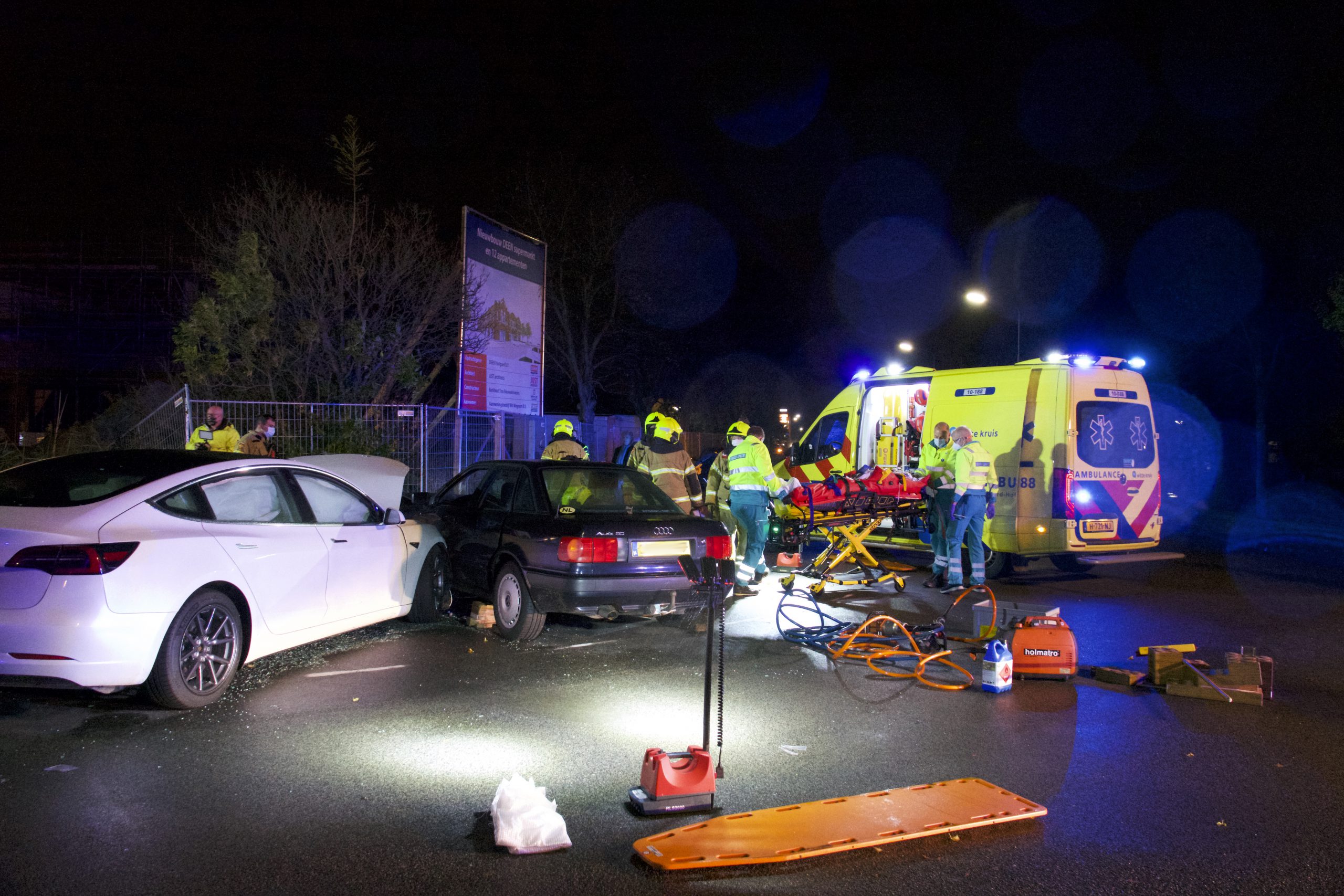 De Audi kwam van de Loopakker en die is hard tegen de nieuwe Tesla aangereden. De bestuurder van de Audi is hierbij beklemd in zijn auto komen te zitten.